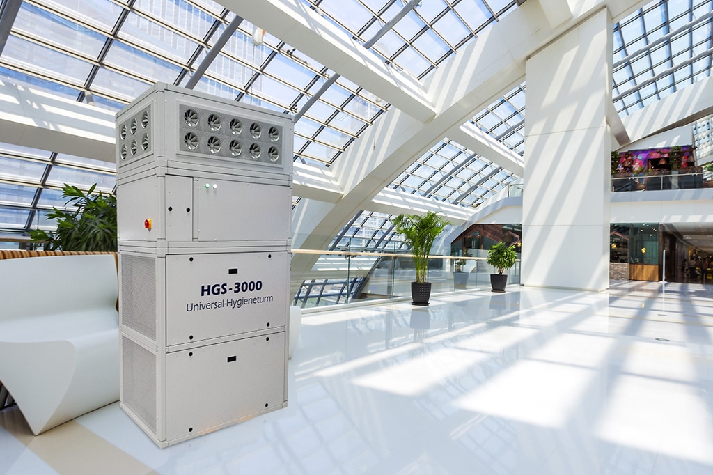 Der Hygieneturm LH HGS 3000 im Vertrieb von Steinicke ist für große Räumlichkeiten wie Foyers, Einkaufszenten oder Messe- und Produktionshallen vorgesehen. (Bild: Steinicke)