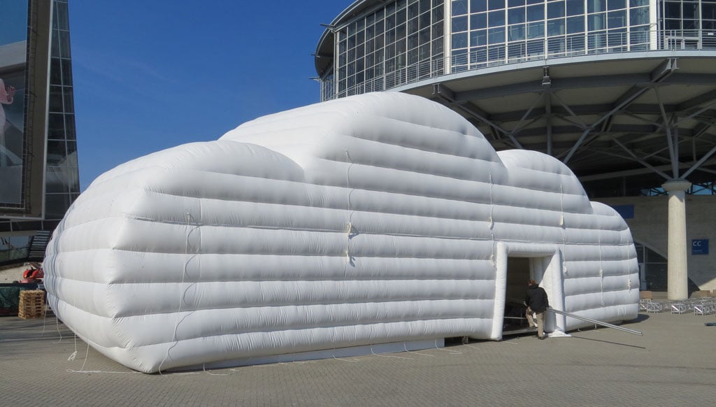 Aufblasbare Zelte – auch Inflatables genannt – gestalten immer öfter die bestehende Zeltlandschaft mit: Zum einen lassen sie sich in kurzer Zeit aufbauen und zum anderen bieten sie spannende Möglichkeiten für Branding und Sonderformen. Gutes Beispiel dafür ist das Amazon-Cloud-Zelt des österreichischen Herstellers no problaim: Der Grundriss dieser Lösung betrug 18 x 12 Meter bei einer Höhe von sieben Metern und ließ sich innerhalb von 15 Minuten aufblasen. Aufgrund der Größe musste dieses Zelt allerdings innen noch von einer Truss-Konstruktion gestützt werden, deren Aufbau etwa einen Tag in Anspruch nahm.