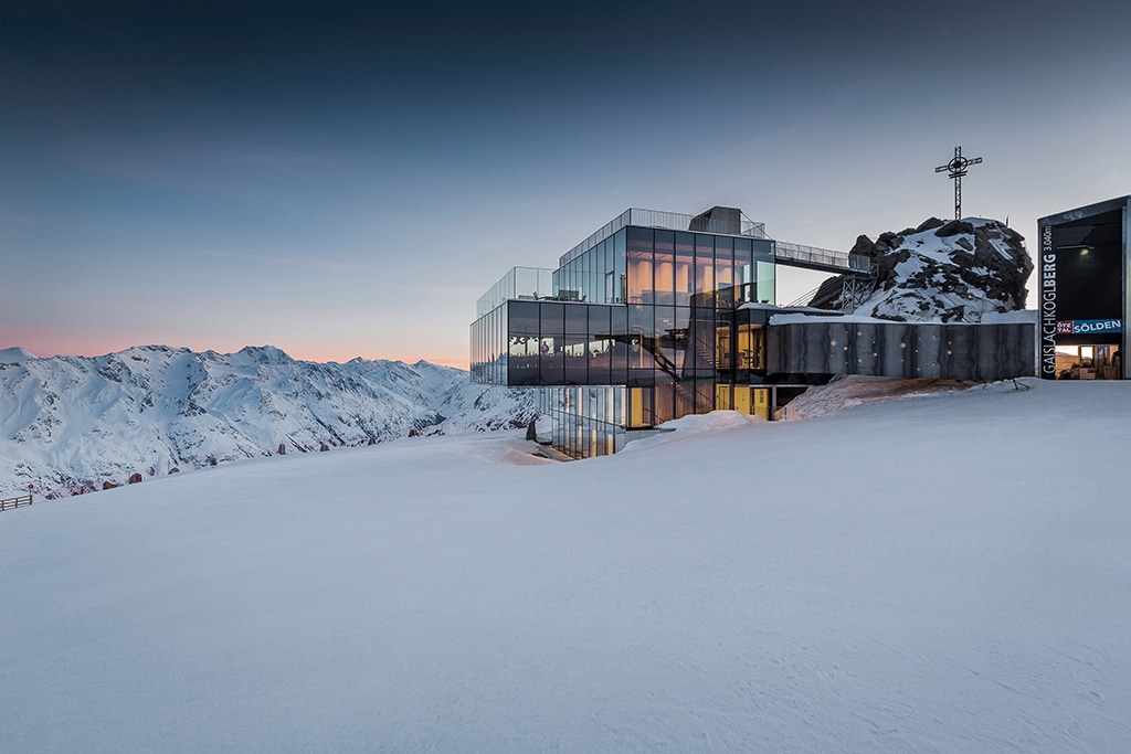 Auf 3.000 m Höhe, eingebettet in die spektakuläre Kulisse der Alpen liegt einem hier sprichwörtlich die Welt zu Füßen – die gläserne Fassade des Ice Q am Gaislachkogl in Tirol überzeugte schon die großen Filmemacher Hollywoods. Die futuristische Architektur des Gourmetrestaurants war 2015 Drehort für Spectre mit Daniel Craig alias James Bond. Uns fasziniert an dieser Location vor allem das Zusammenspiel von puristischem Design und der rauen Natur der Alpen aus Fels und Eis.