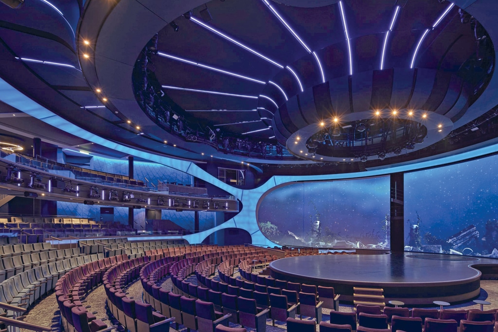 Eine weitere visuelle Besonderheit an Bord stellt zudem eine transparente und multimedial bespielbare Wand aus zehn 49-Zoll-Displays dar, bei der vier Paneele als schwenkbare Türelemente fungieren. Teil des komplexen Lichtkonzepts sind darüber hinaus die in fast allen Eventbereichen verbauten Showlight-Systeme von Robe, die mit ihren Scannern, Moving-Heads und LED-Scheinwerfern das atmosphärisch verbindende Element der einzelnen Theater, Clubs und Live-Locations des Kreuzfahrtgiganten bilden. Darüber hinaus wurde das Schiffsinterieur mit insgesamt knapp 125m² hochwertigen und teils beweglich montierten LED-Wänden von Absen ausgestattet.