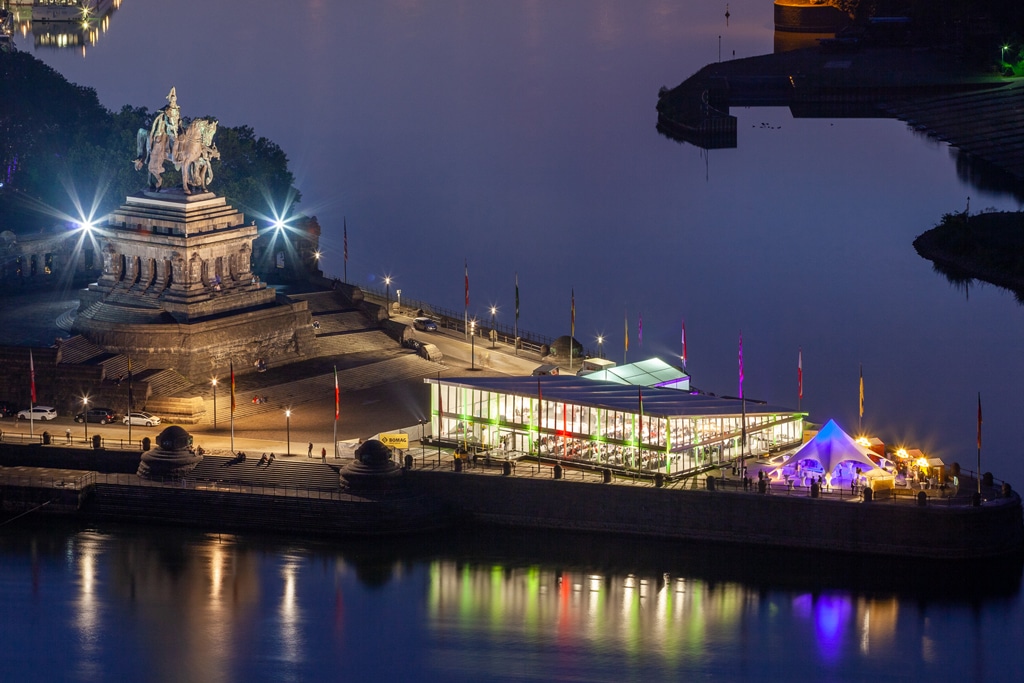 Optimal für Produktpräsentationen oder als VIP-Zelt ist das Riverside. Mit der kubischen Zeltarchitektur und seiner wahlweise geschlossenen Fassade oder Rundumverglasung für direkten Einblick lässt es sich an jedes Event anpassen. Die umlaufende Attika gestattet vielfältige Gestaltungs- und Branding-Möglichkeiten.