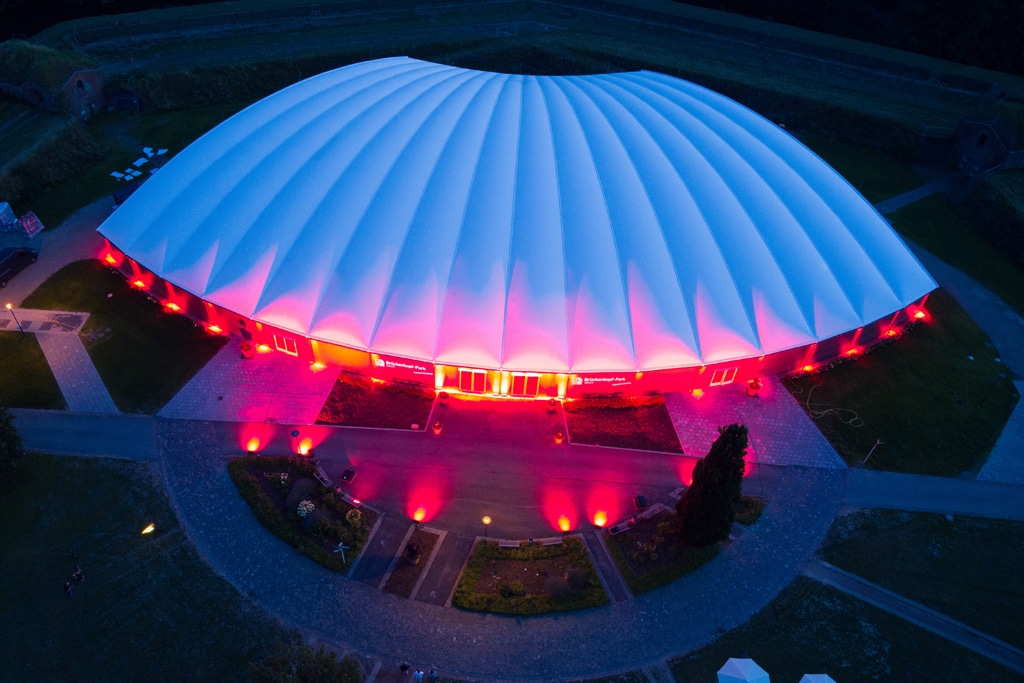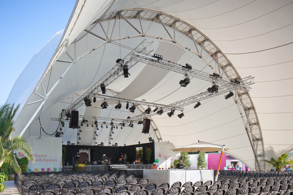Die Tent Hall überzeugt durch eine akustikoptimierte und muschelförmige Bauweise – „weltweit einmalig!“, so Brosterhues. Es handelt sich um einen kompletten Thermobau mit selbstleuchtender Außenfassade. Damit zeichnet sich die Tent Hall als Austragungsort für musikalische Highlights aus, eignet sich aber auch für Großkonferenzen oder genauso gut als temporäre Stadthalle.