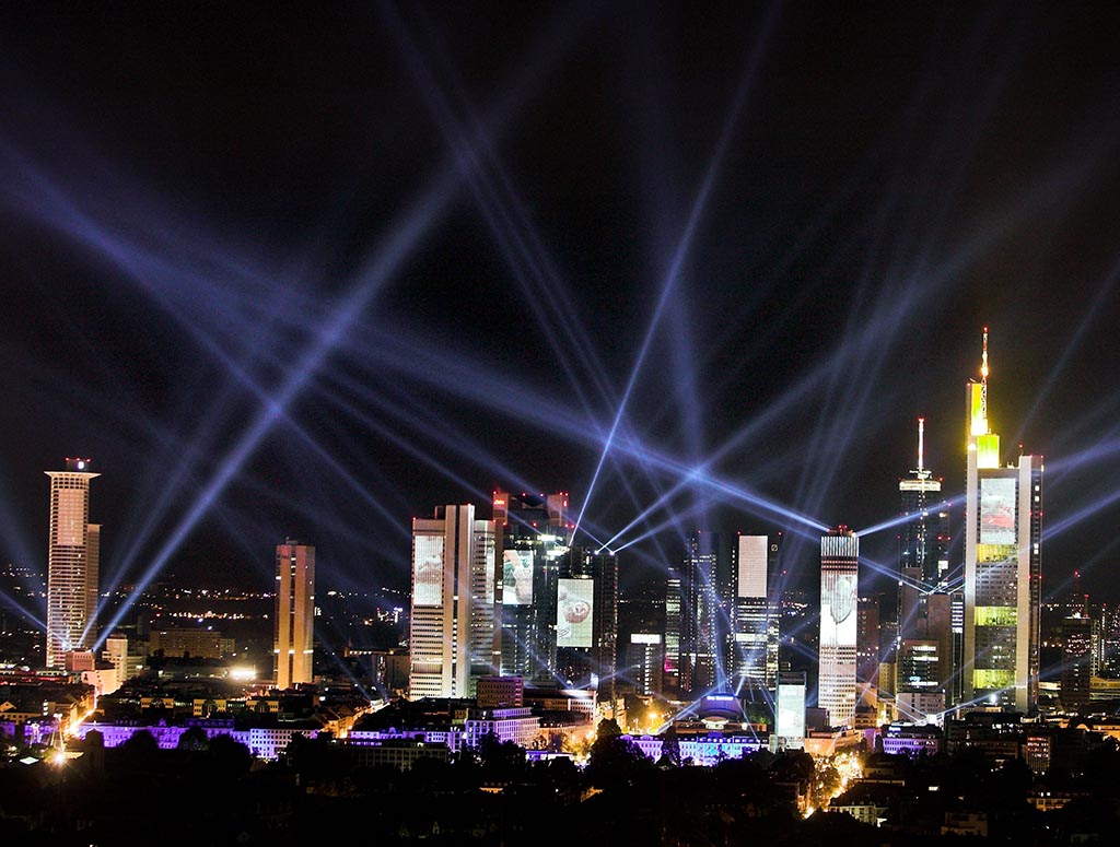 Die Nähe von Architekten zu den Hochhäusern in Frankfurt lässt fantasiebegabte Persönlichkeiten wie Lambrette natürlich auch auf diesen Wolkenkratzeroberflächen spielen. Die „SkyArena“ zur Sommermärchen-WM 2006 war so ein dickes Ding auf dieser für Deutschland einmaligen Skyline! Das taten Hermann Obrusnik und Moses Mrohs bereits 1999 für das 30-jährige Jubiläum der Mondlandung. Für den Kunden Omega (die mit den besonderen Weltraumuhren) wurde eindrucksvoll ein Eins-zu-eins-Foto der Saturn-Rakete auf das damals höchste europäische Hochhaus aufgeklebt. Die Commerzbank-Immobilie in Frankfurt steht Events übrigens immer noch offen. Während Obrusnik nach Hamburg wechselte, blieb der Tausendsassa Mrohs der Rhein-Main Region treu – nunmehr 25 Jahre.
