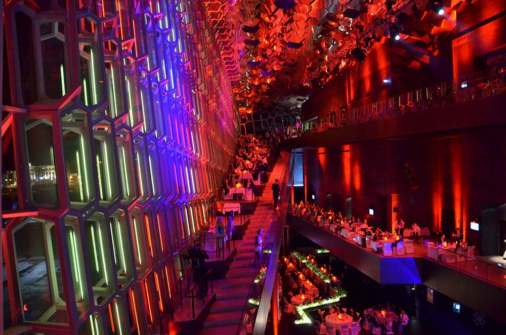 Unsere Empfehlung: Die HARPA im isländischen Reykjavik, eines der schönsten und spektakulärsten Konzerthäuser der Welt. Das Gebäude ist pure Sinnlichkeit und eine Einladung, mit ihm kreativ zu „spielen“. Die Fassade greift in ihren Formen die Geometrie von Kristallen des isländischen Doppelspates auf. An der Südseite ist die Struktur dreidimensional ausgeführt, Millionen von frei ansteuerbaren LEDs ermöglichen darin Lichtspiele in allen nur denkbaren Variationen. Durch das von Süden einfallende Sonnenlicht ergeben sich im gesamten Foyer ständig ändernde Lichteindrücke – ein „Palast des Lichts“ voller Zauber, der subtile Stimmungen vom goldenen Sonnenuntergang über Wasserfälle bis hin zum Feuer- und Vulkanausbruch erfasst. Was für ein magischer Ort für ein großes Dinner und anschließend ging es in den Konzertsaal zu einer unvergesslichen Preisverleihung!