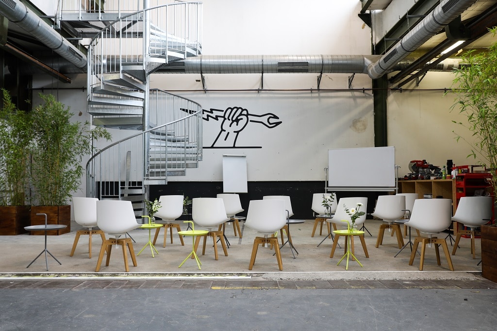 Party Rent Frankfurt kreierte in dieser inspirierenden Umgebung fünf verschiedene, Corona-konforme Ausstattungskonzepte. Im Innenbereich entstanden eine Tagungslocation mit DSW Chairs und ausreichenden Abständen sowie Settings für ein Get-together; in einer der Werkstätten ein Möblierungskonzept für einen Workshop. Die Dachterrasse war der ideale Ort für zwei Hochzeitssettings: eines in Classic White mit den Barhockern Le Mans und Stehtischen Kranich, ein zweites im angesagten Boho Look mit Bristol-Tischen, den About A Stool Barhockern und den Stühlen Skool.
