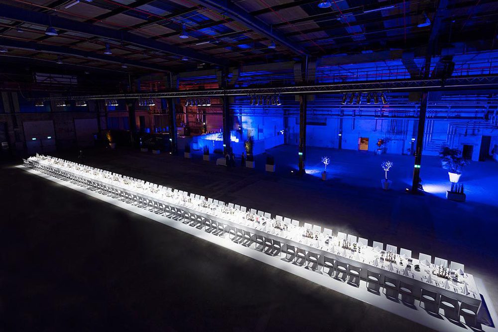 „Das Besondere an der Halle 45 sind der industrielle Charakter und die große Flexibilität in der Raumaufteilung“, erzählt Dr. Hanns-Christian von Stockhausen, einer der beiden Geschäftsführer der neuen Betreibergesellschaft. „Das gibt jedem Firmenevent, jeder Gala eine besondere Note und ein hohes Maß an Individualität.“ Tatsächlich lassen sich in der „nackten“ Halle maßgeschneiderte Events aller Art auf die Beine stellen. Die Halle 45 hat eine Fläche von rund 5.000 m2 und eine Giebelhöhe von 13 Metern. Sie besteht aus einem Hallenhauptschiff und zwei Seitenschiffen, die sich durch das variable Raumsystem vertikal und horizontal gliedern lassen, und zwar in nahezu jede gewünschte Größe. Dabei helfen die beiden Kranbahnen, die sich in jedem Hallenschiff an der Decke befinden. Um die Räume abzutrennen, können die Kräne entsprechende Spezialvorhänge halten. Da ein einzelner Kran bis zu 14 Tonnen Gewicht trägt, kann er auch in der Vorbereitung von Veranstaltungen genutzt werden, etwa im Messebau.