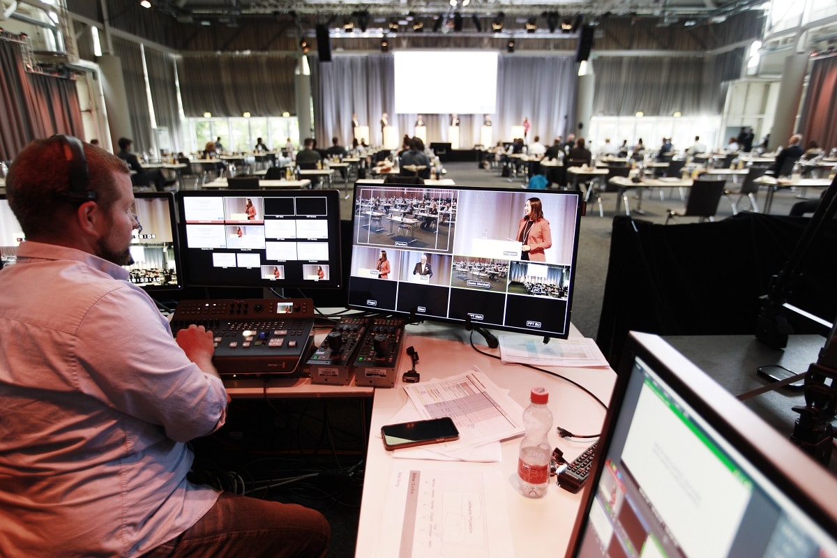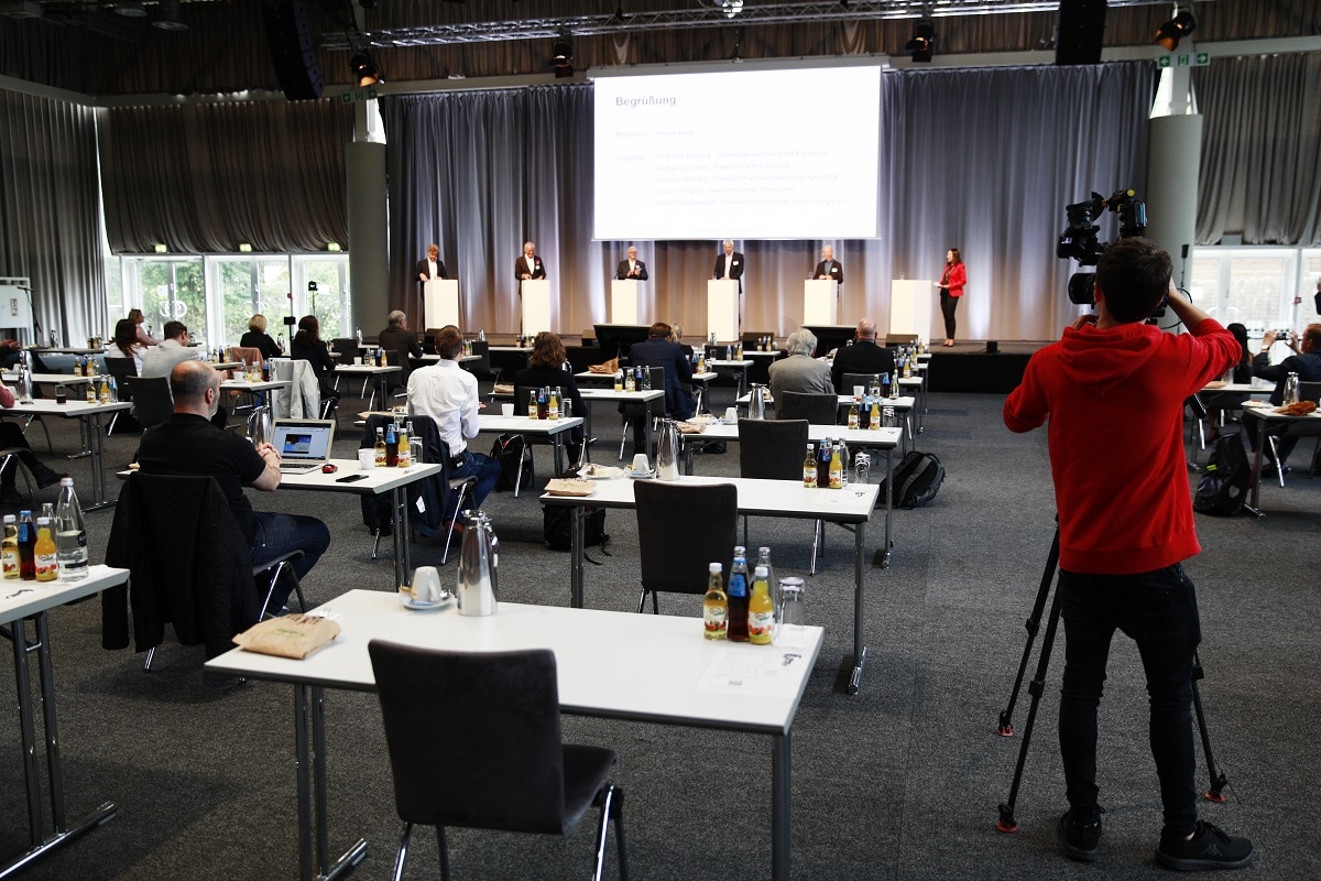 So wurde die Gartenhalle für den Energiekongress des Netzwerks fokus.energie e.V. und der TechnologieRegion Karlsruhe unter Einhaltung eines abgestimmten Sicherheits- und Hygienekonzepts zum ersten Mal zum Streaming-Studio. Auch die Gesellschaft für Informatik e.V. entschied sich für die Virtualisierung ihrer 50. Jahrestagung und setzte in Zusammenarbeit mit der Messe Karlsruhe, der AVDATA GmbH und dem Weizenbaum-Institut eine vielseitige moderne Plattform zur videogestützten Präsentation, Interaktion und Zusammenarbeit ein. Eine Besonderheit war die Umsetzung der persönlichen Gespräche während der Pausen des Tagungsprogramms in virtuellen interaktiven Räumen, um den persönlichen Austausch, der bei physischen Konferenzen ein wichtiger Bestandteil ist, nachzubilden.