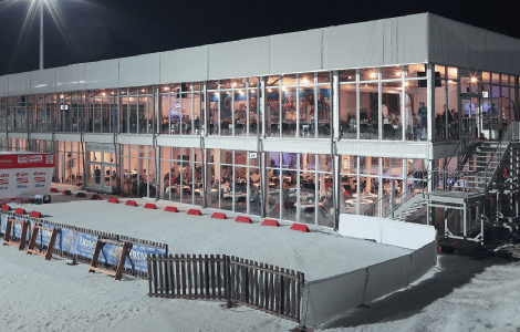 Ein zweistöckiges Röder Solution-Highend 30 × 60 m fungierte als VIP-Hauptzelt, das während des Weltcups täglich bis zu 1.700 Gäste beherbergte. Diese genossen einen hervorragenden Blick auf das Sportgeschehen auf der Startgerade, dem Schießstand und der Omega-Strafbahn, da das Event-Zelt zu 80 % mit Glasfassade ausgestattet war. Die Topausstattung mit Küchen auf beiden Etagen, einem Kindergartenbereich und vier Sponsor-Arealen sorgte für besten Komfort, zudem war das VIP-Zelt mit der neuen Haupttribüne der Arena verbunden.