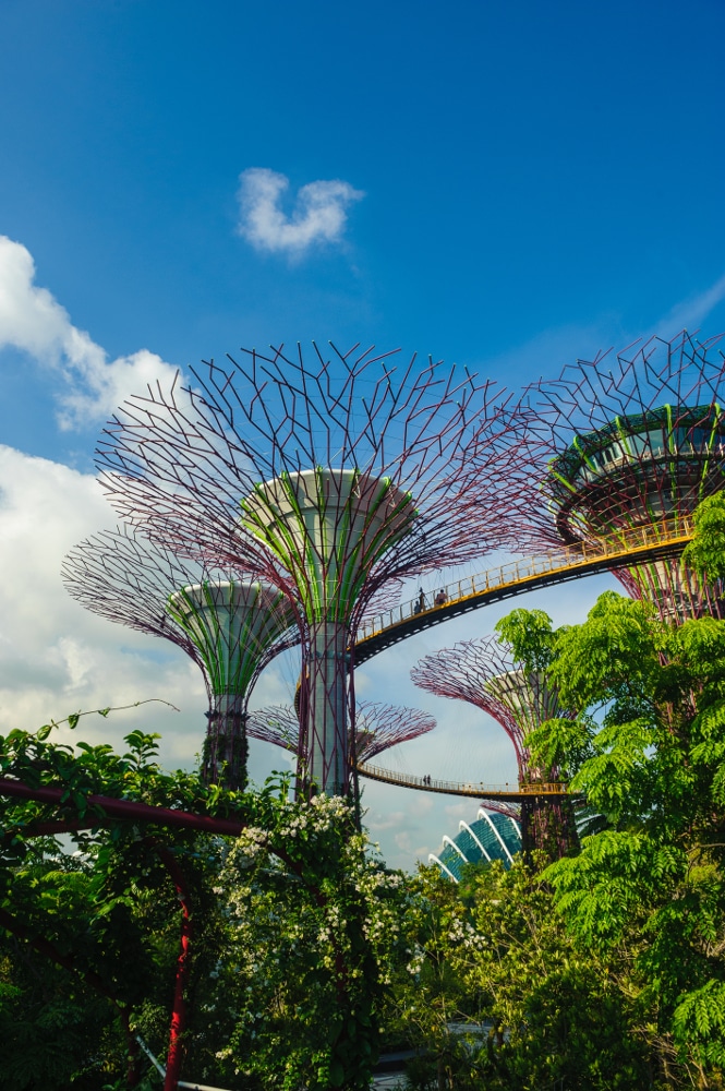 In den „Gardens by the Bay“ stehen die „grünen“ Wahrzeichen Singapurs mit überragender Symbolkraft: Die Supertrees – künstliche Bäume bis zu einer Höhe von 25 m. Sie spenden nicht nur Schatten, sondern sind so gebaut, dass sie in einem Zylinder Wasser auffangen. Allerdings in solchen Mengen, dass es für die vollständige Bewässerung der Hallen auf dem Gelände reicht. Dazu haben sie Sonnenkollektoren, die die gesamte Anlage mit Energie versorgen können. Es ist das reinste Vergnügen, die Bäume über das Hängebrückensystem, dem Skywalk, zu erkunden. Zu einem Gespräch mit dem STB – Singapore Tourism Board – kehren wir auf der Baumkrone in eines der begehrtesten Restaurants der Stadt, das Indochine, ein.