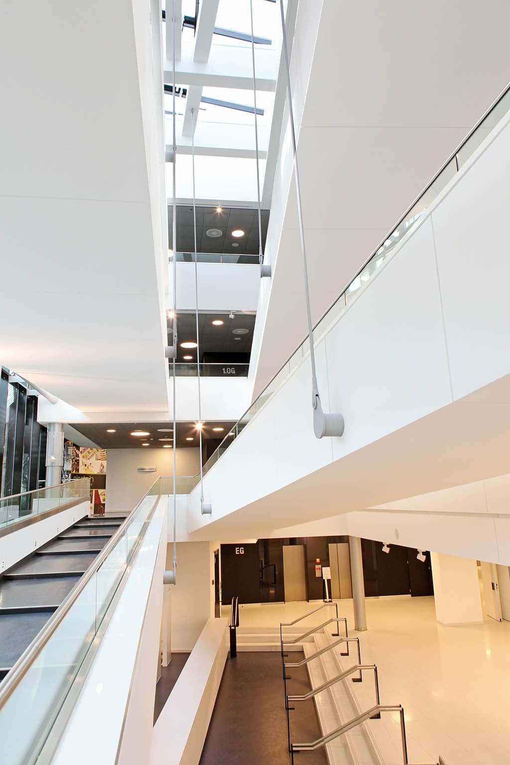 Fremdproduktionen können über im Haus verteilte Anschlussfelder bequem auf die bestehende Infrastruktur zugreifen. Induktionsschleifen lassen Menschen mit eingeschränkter Hörfähigkeit akustisch am Geschehen teilhaben. Tagungszentrum Das neu erbaute Tagungszentrum überzeugt mit einer angenehmen Atmosphäre: Viel Tageslicht strömt durch raumhohe Fensterfronten ein und begünstigt ein konzentriertes Arbeiten. Bei Bedarf lassen sich die Räume selbstverständlich abdunkeln. Selbst große und schwere Exponate wie beispielsweise Automobile können im Tagungszentrum gezeigt werden. Logistisch vorteilhaft ist ein eigener Zugang. Durch verfahrbare Trennwände lassen sich die unterschiedlich großen Einzelräume sowohl im Erdgeschoss als auch im ersten Obergeschoss bei Bedarf zu einer lang gestreckten Fläche verbinden, welche mehr als 400 Personen Platz bietet. Zur medientechnischen Ausstattung gehört im EG ein fest an der Decke installierter Mitsubishi LCD-Beamer. Sind mehrere Tagungsräume miteinander verbunden, kommen ergänzend Projektionsmobile mit Kurzdistanzprojektoren zum Einsatz. Für die Beschallung steht ein ergänzbares Bose „L1 Compact Portable Line Array System“ bereit. Teil der Ausstattung ist außerdem ein Rednerpult. Als digitale Beschilderung kommen im Haus diverse Monitore zum Einsatz, die sowohl über Veranstaltungen und Raumbelegungen informieren als auch der Besucherführung dienen und künftig zusätzlich für Werbezwecke genutzt werden sollen.