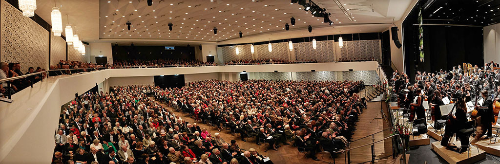 Eine Verquickung von Veranstaltungsbestandteilen in der Rhein-Mosel-Halle und dem Schloss liegt auf der Hand, und je nach Art des Events können durch eine geschickte Wahl des Ortes unterschiedliche (Stimmungs-) Schwerpunkte gesetzt werden. Ein 4-Sterne Mercure Hotel mit 168 vollklimatisierten Zimmern befindet sich praktischerweise genau zwischen Rhein-Mosel Halle und Kurfürstlichem Schloss: Aus der Halle ist der direkte Zugang in das Hotel möglich. „Das Angebot von Koblenz-Kongress beschränkt sich nicht auf die Vermietung der Räume“, sagt Raimund Lehmkühler über die Leistungen seines Teams. „Auf Wunsch decken wir als FullService-Anbieter sämtliche Veranstaltungsaspekte inklusive Teilnehmermanagement, Kongressorganisation, Catering, Buchung der Hotelzimmer und Begleitprogramm aus einer Hand ab.“ Koblenz kann’s! Die neue Rhein-Mosel-Halle präsentiert sich architektonisch gelungen und glänzt mit einem flexiblen Nutzungskonzept, das in der gegebenen Größenordnung keine Wünsche offen lassen sollte. Für größere Veranstaltungen ist insbesondere der Große Saal prädestiniert, dessen Akustik selbst anspruchsvolle Gäste zu überzeugen vermag – das Staatsorchester Rheinische Philharmonie ist regelmäßig hier zu Gast, und dem Vernehmen nach sind die Klassikkonzerte seit dem Umbau durchweg ausverkauft.