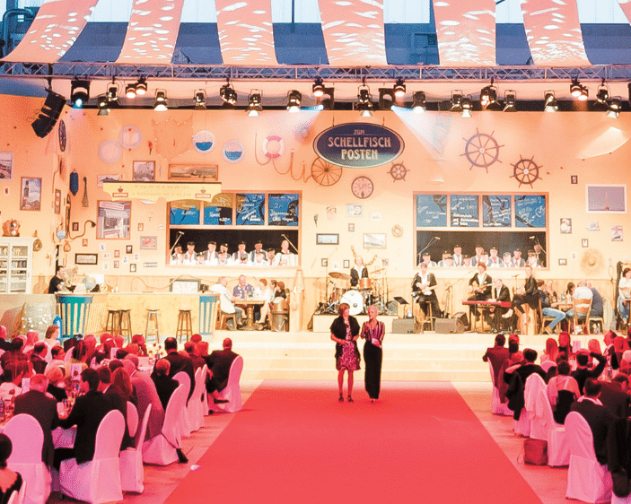 Neben dem ausgeprägten Zelte-Portfolio gehören auch Location-Umbau, Bühnen- und Kulissenbau, Messebau und Veranstaltungstechnik zum Leistungsspektrum des nahe Koblenz gelegenen Unternehmens. Um etwa das große Jubiläum von 50 Jahre Hagebau angemessen feiern zu können, verwandelte das Tent-Dimensions-Team einen tristen Flugzeughangar in einen grandiosen Veranstaltungsort: So wurde neben Licht- und Tontechnik, Bühnenbau und Ausstattung der berühmte Schellfischposten, Hamburgs älteste Seemannskneipe, kulissenartig nachgebaut.
