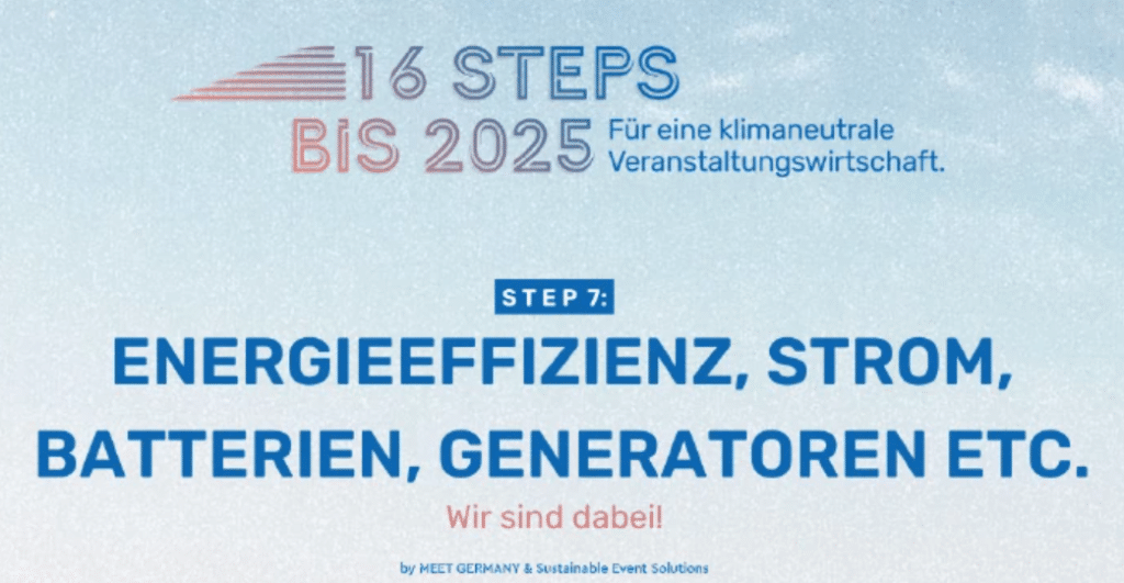 Die Initiative „16 Steps bis 2025 – Für eine klimaneutrale Veranstaltungswirtschaft” legt ihren Fokus auf Energieeffizienz als siebten Schritt hin zu einer klimaneutralen Veranstaltungswirtschaft. Mit dem Ziel, den sechstgrößten Wirtschaftszweig zu transformieren, betont die Initiative die zentrale Rolle der Energiewende und Energieeffizienz in der Branche.