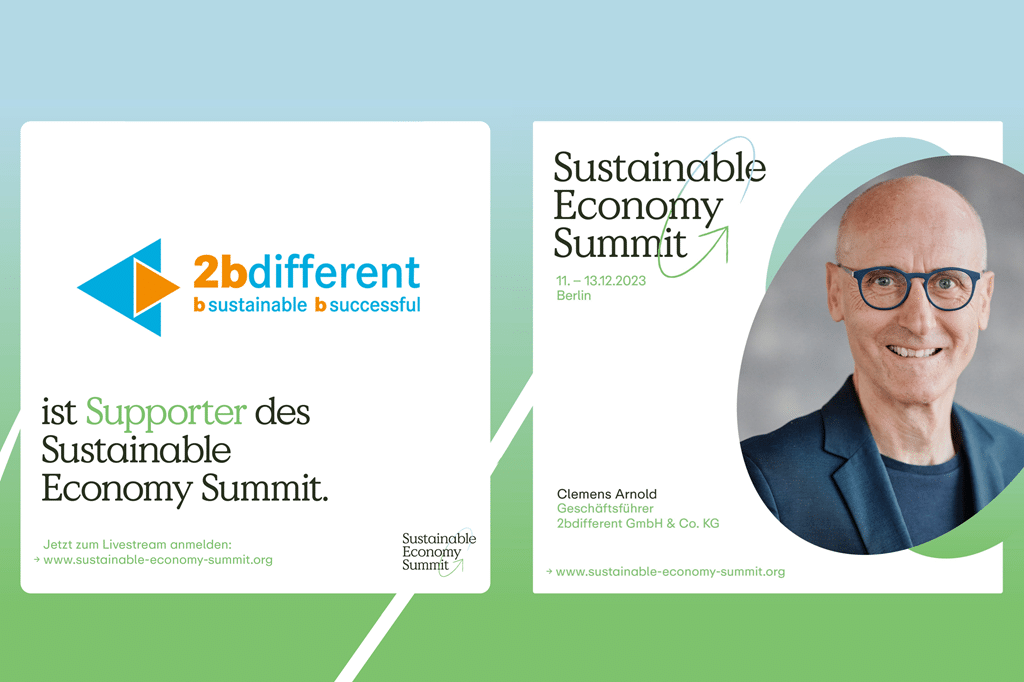 Die Nachhaltigkeitsberatung 2bdifferent wurde offizieller Partner des Sustainable Economy Summit, der vom 11. bis 13. Dezember 2023 in der Eventlocation Axica und dem Allianz Forum in Berlin stattfinden soll. Der Summit wird von einem Bündnis transformativer Wirtschaftsverbände getragen und steht unter der Schirmherrschaft des Bundesministeriums für Wirtschaft und Klimaschutz. Schirmherr ist Dr. Robert Habeck, Bundesminister für Wirtschaft und Klimaschutz. Gefördert und unterstützt wird die Pilotveranstaltung von der Deutschen Bundesstiftung Umwelt (DBU).