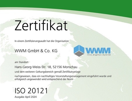 WWM hat als erstes Messebau- und Eventunternehmen in der DACH-Region die Zertifizierung nach der neuen DIN ISO 20121:2024 für nachhaltiges Veranstaltungsmanagement erfolgreich abgeschlossen. Der gesamte Leistungsprozess von WWM – von der Beratung und Konzeption über die Produktion und Lagerung bis hin zur Montage – wurde nach den neuesten Standards zertifiziert. 2bdifferent, der Spezialist für Nachhaltigkeit in der Eventbranche, hat das Unternehmen dabei individuell beraten und unterstützt.