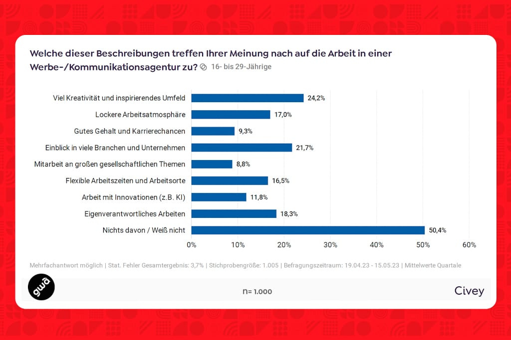 Die mittels der Umfrage ermittelten Top-Fünf-Wünsche junger Menschen an Arbeitsplatz und potentielle Arbeitgeber sind laut Studie ein gutes Gehalt und Karrierechancen (68,7%), eigenverantwortliches Arbeiten (48,7%), eine lockere Arbeitsatmosphäre (45,8%), Flexibilität in Bezug auf Arbeitszeiten und -ort (43,5%) sowie ein kreatives und inspirierendes Umfeld (21,3%). Gleichzeitig zeige die Umfrage eine geringe Kenntnis über die Arbeitsrealität in Agenturen, die laut Civey bereits „in hohem Maße“ die geäußerten Wünsche an einen potentiellen Arbeitgeber erfüllen sollen. So gibt jeder zweite Befragte an, keine genauen Kenntnisse über die Arbeitsbedingungen in einer Agentur zu haben. Gleichzeitig würden nach wie vor Klischees und verzerrte Wahrnehmungen über den Agenturalltag existieren – etwa was Bezahlung, flexible Arbeitszeiten oder Agilität und Kreativität angeht.