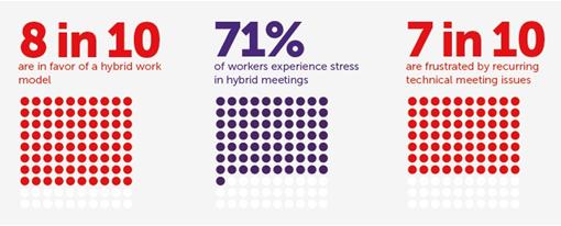 Die Umfrage-Ergebnisse geben an, dass fast eine:r von drei Arbeitnehmer:innen das Gefühl habe, in hybriden Meetings nicht gehört zu werden, und die Forderung nach einer besseren Einbeziehung in Meetings verstärkt seien.