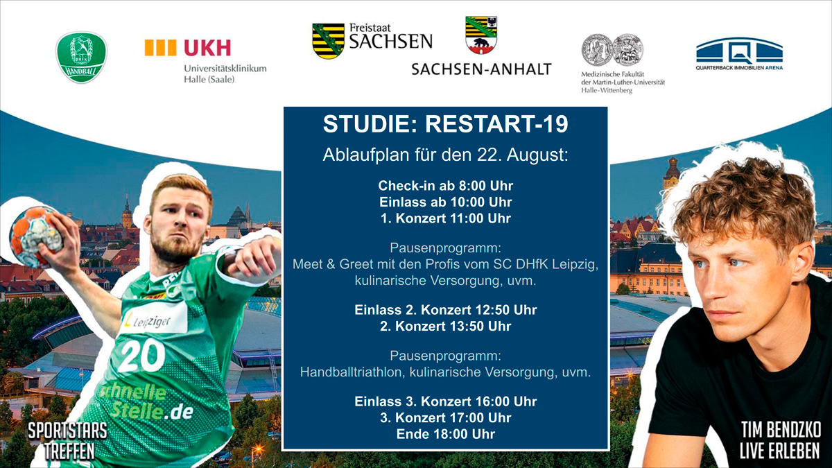Das zwei Bundesländer übergreifende Projekt Restart-19 der Universitätsmedizin Halle (Saale) wird unterstützt vom Ministerium für Wirtschaft, Wissenschaft und Digitalisierung des Landes Sachsen-Anhalt und den Staatsministerien für Wissenschaft, Kultur und Tourismus beziehungsweise Soziales und Gesellschaftlicher Zusammenhalt des Freistaates Sachsen. Partner des Projekts sind der SC DHfK Leipzig, Handball, und die ZSL Betreibergesellschaft mbH.