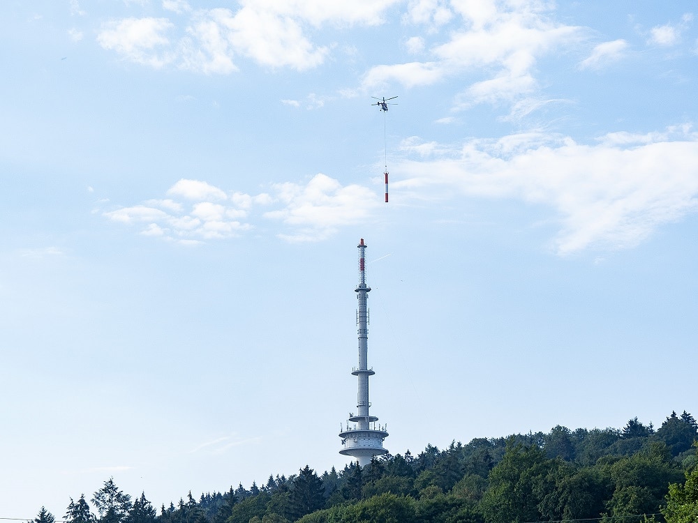Der Austausch des ca. 15 Meter hohen GFK-Zylinders mit einem Durchmesser von rund 160 Zentimeter war notwendig, da für die Verbreitung von DVB-T2 HD und freenet TV neue, leistungsfähige Sendeantennen erforderlich sind. Diese befinden sich in der Mastspitze. Sowohl die Demontage des alten, nicht mehr benötigten GFK-Zylinders als auch die Montage des neuen, mehrere Tonnen schweren Zylinders erfolgten per Lastenflug mit einem Helikopter. Für die Dauer der Lastenflüge war das Areal rund um den Sendeturm weiträumig gesperrt worden.