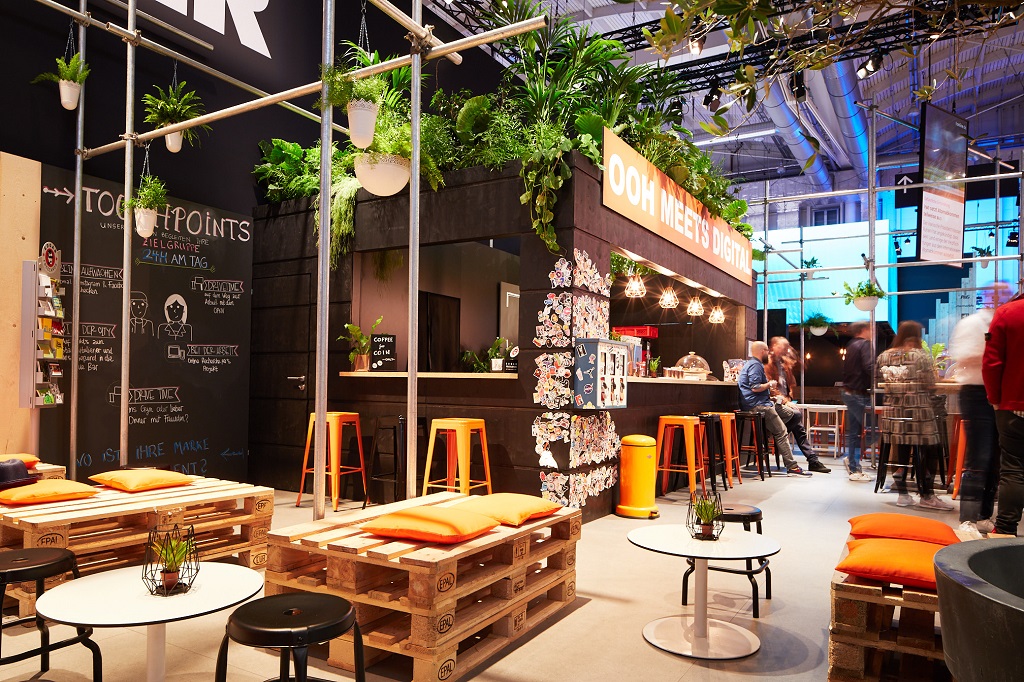 Für die Gestaltung der Bar wurde ein Kiosk-Konzept gewählt, das den Charakter eines Szenetreffs in relaxter Atmosphäre widerspiegeln sollte. Ein Kaugummiautomat an der Kioskwand, große Tafeln, bunte Klappstühle an der Standrückwand und eine Dachbegrünung setzten Akzente. Komplettiert wurde das innerstädtische Bild des Messestands durch Mediastelen die das Angebot von Ströer zeigten.