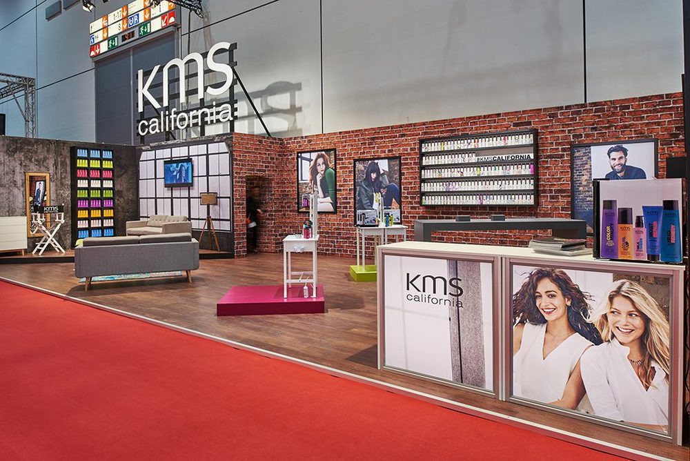 Im Kontrast zum Goldwell-Stand, der den Lifestyle-Anspruch der Marke in einer durchgestylten Optik inszenierte, präsentierte sich der Messestand von KMS California im Charakter eines urbanen Lofts. Eine industrielle Architektur mit Brickwall und Holzboden im Vintage-Style prägten den rund 85 Quadratmeter großen Stand. Das reduzierte Interieur mit bunten Schaukelstühlen und Tischpodeste, bot eine optimale Bühne für die umfangreiche und sachliche Produktpräsentation auf Holzregalen.