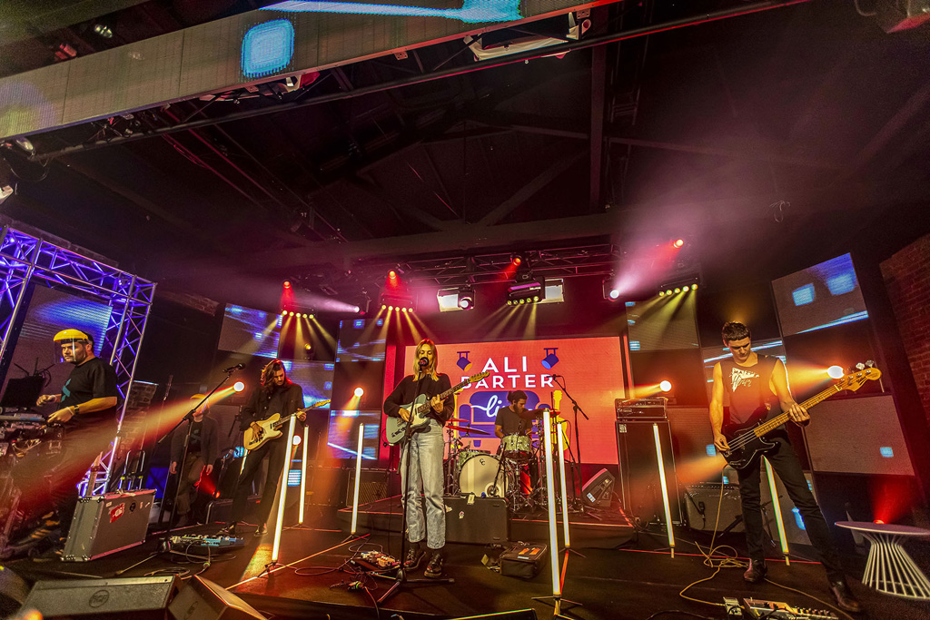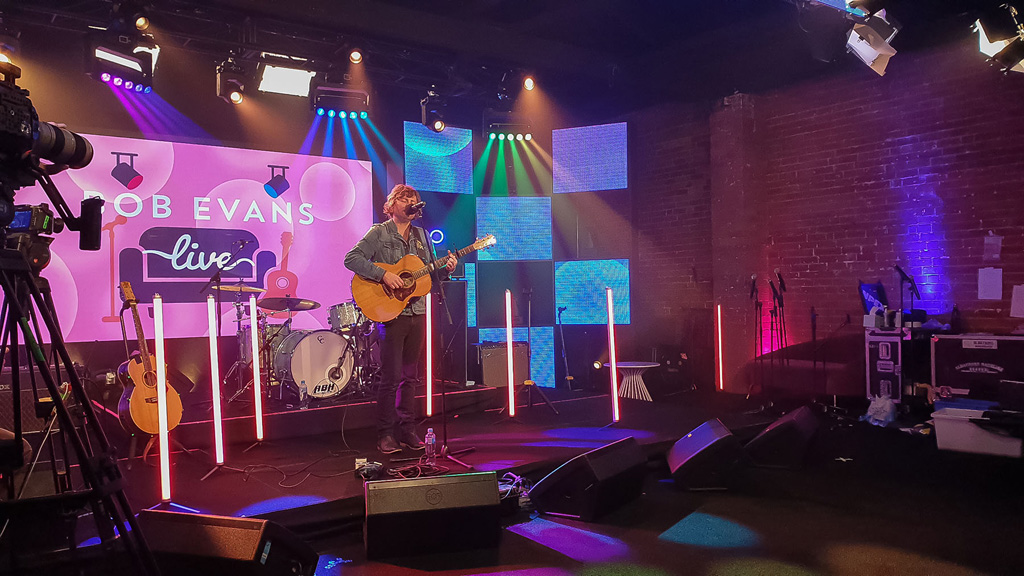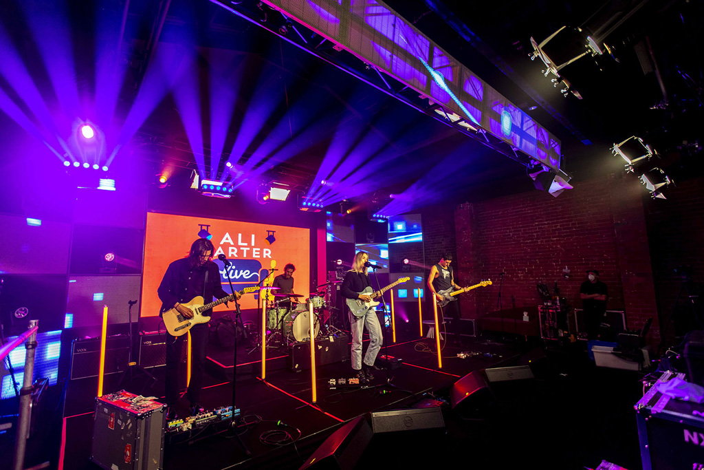 Die Produktion hält sich an Abstandsregeln, mit einem Maximum an 10 Leuten gleichzeitig im 250m² großen Studio. Eine dafür ausgerichtete Bühne bietet separate Bereiche für Bands und Comedians. Die Astera AX1 markieren dabei den persönlichen Bereich für jeden Einzelnen.