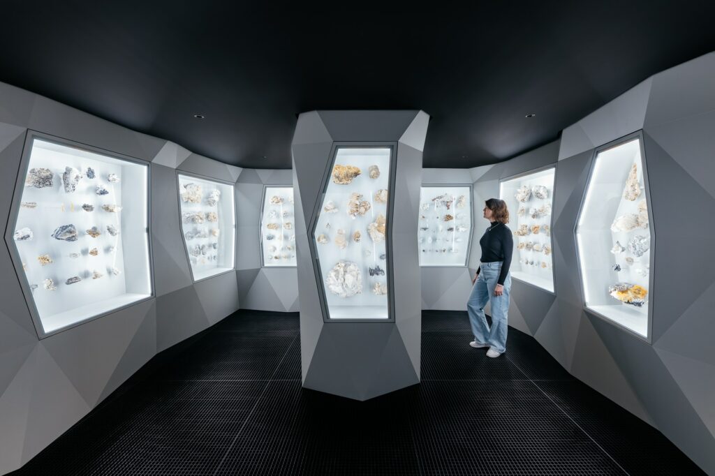 Nach dem Rundgang durch die drei Hauptgeschosse schließt sich im Untergeschoss des Gebäudes die inszenierte „Crystal Cave“ an. Der Besuchende betritt die raumgreifende Installation über einen dunkel gehaltenen Eingangstunnel. Im ersten Bereich, der „Real Cave“ geht er auf einem schwarzen Gitterroststeg durch eine glitzernde Kristallhöhle, die aus Kristallen des norwegischen Kalkbergwerkes von Brevik nachgebaut wurde – ein immersives Erlebnis. Im angrenzenden Raum, der „Artificial Cave“, entlehnen sich die Vitrinen den prismatischen Formen ihrer Objekte. Höhepunkt der Raumfolge ist die „Glowing Cave“, der die magische Farb- und Formpracht der ausgestellten Steine mithilfe von UV-Licht in Szene setzt.