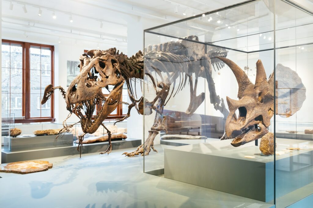 Natural History Museum, Oslo. Level 1, Evolution of Life I, Tyrannosaurus-Rex (Nachbildung) und Triceratops-Schädel. (Bild: Marcus Sies)