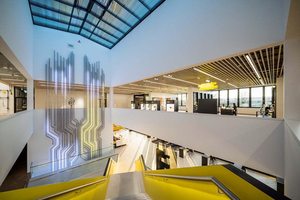 Entstanden sei ein ganzheitliches interaktives Markenerlebnis, das weit mehr biete als ein reines Seminarcenter. Auf insgesamt knapp 2.800 m² Ausstellungsfläche seien über 90 Exponate, baulich konzipierte Einblicke sowie ein medialer Erlebnisraum entstanden. Verbindendes Element und buchstäblich den „Pulsschlag“ des Gebäudes bilde eine sich über drei Etagen erstreckende ca. 18 m hohe Skulptur mit Lichtimpulsen, gefertigt mit Viega-Rohren. Unter dem Motto „Verborgenes sichtbar machen“ gebe das Gebäude den Besucher:innen Abläufe preis, die normalerweise unbemerkt hinter geschlossenen Wänden und Böden abliefen: Verglaste Aussparungen in den Wänden legten die Installationstechnik offen und zeigten die „Lebensadern des Gebäudes“ im täglichen Einsatz.