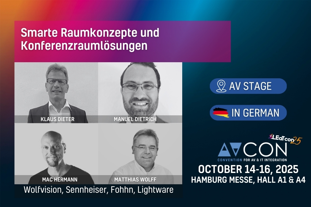 Gleich vier Experten beleuchten am 15.10 um 11.15 auf der AVcon smarte Raumkonzepte und Konferenzraumlösungen. Von ihrer Expertise profitieren lassen uns Matthias Wolff, County Director Lightware Deutschland, Manuel Dietrich, Technical Application Engineer DACH Sennheiser, Klaus Richter, Verkaufsleiter Nord und Ost Deutschland bei WolfVision und Mac Hermann, KeyAccount Manager & Projektsupport der Fohhn Audio AG.
