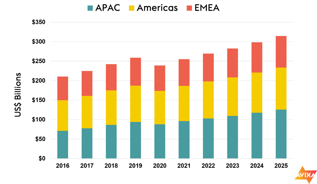 APAC wird von allen Regionen das stärkste Wachstum aufweisen, mit einer durchschnittlichen jährlichen Wachstumsrate (CAGR) von 7,4 Prozent von 2020 bis 2025 – verglichen mit 4,7 Prozent für den amerikanischen Kontinent und 4,5 Prozent für EMEA. Im Jahr 2025 werden sich die Pro-AV-Erlöse in APAC auf 126 Milliarden Dollar belaufen, verglichen mit 108 Milliarden Dollar für Amerika und 81 Milliarden Dollar für die EMEA.