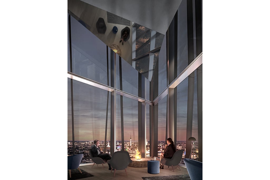 Der Estrel Tower soll mit 176m Höhe Berlins höchstes Hochhaus und somit auch ein eindrucksvolles Wahrzeichen der Hauptstadt werden. Der als mixed-use geplante Estrel Tower bietet bei der Eröffnung eine Mischung aus Hotel, Serviced Apartments, Büros und kreativen Flächen. Herzstück ist das lichtdurchflutete, begrünte öffentliche Atrium, in dem neben einer lokalen Bäckerei, eine Galerie und ein Inkubator für Start-ups vorgesehen sind. Damit soll der persönliche Austausch zwischen Besucher:innen und Bewohner:innen des Projekts ins Zentrum gestellt werden.