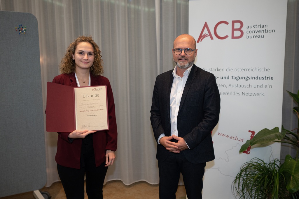Bereits zum achten Mal hat das Austrian Convention Bureau (ACB) den Best Meeting Thesis Austria Award an AutorInnen von Abschlussarbeiten mit hoher Relevanz für die Tagungsbranche verliehen. Mittels eines zweiteiligen Bewertungsverfahrens durch ACB Meeting Professionals wurden jeweils eine Bachelor- und Masterarbeit ausgezeichnet.