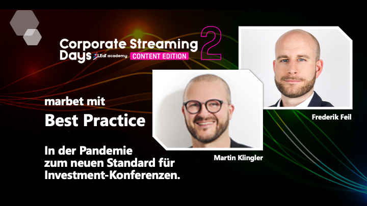 Bei den Corporate Streaming Days 2: Content Edition stellen Frederik Feil und Martin Klingler von marbet den Best Practice Case “In der Pandemie zum neuen Standard für Investment-Konferenzen” vor. Wie lässt sich eine Kapitalmarktkonferenzen digitalisieren? Das zweitägige Education Digital-Event findet am 14.+15. April 2021 statt.