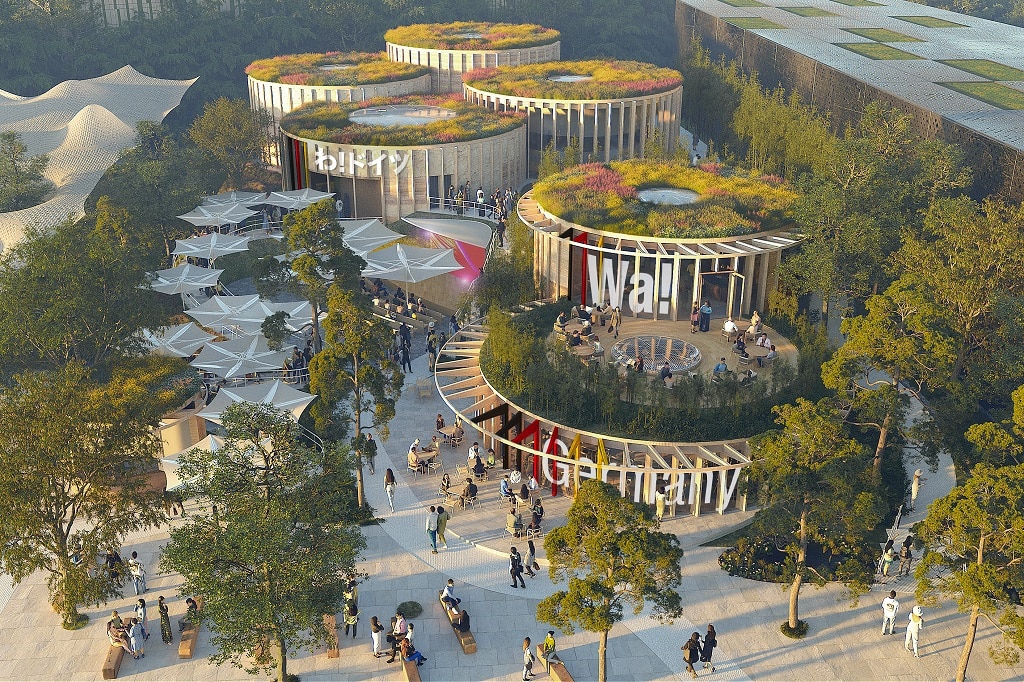 Das Leitmotiv der Zirkularität wirke sich auf alle Aspekte der deutschen Beteiligung aus: den Pavillon selbst, das Besuchserlebnis, das Design und die präsentierten Technologien und Zukunftsvisionen. Ins Gestalterische übersetzt entspreche das der Form des Kreises. Dieser Ansatz werde schon auf den ersten Blick deutlich: Sieben kreisförmige Baukörper aus Holz luden zum Besuchserlebnis ein. Der Pavillon zeige als begehbares Exponat, welchen Einfluss Architektur und Städtebau auf mehr Nachhaltigkeit und Zirkularität haben könnten.