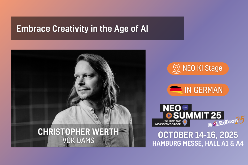 Künstliche Intelligenz eröffnet kreative Möglichkeiten wie nie zuvor – doch wie bleibt man als Mensch relevant in einem von Algorithmen geprägten Umfeld? Auf dem NEO Summit 25 zeigt Christopher Werth, Chief Creative Officer bei Vok Dams, wie Kreative KI sinnvoll einsetzen, ohne ihre eigene kreative Stimme zu verlieren. Statt sich auf Vorhersehbares zu verlassen, geht es darum, Ideen zu entwickeln, die überraschend, frisch und wirklich neu sind.