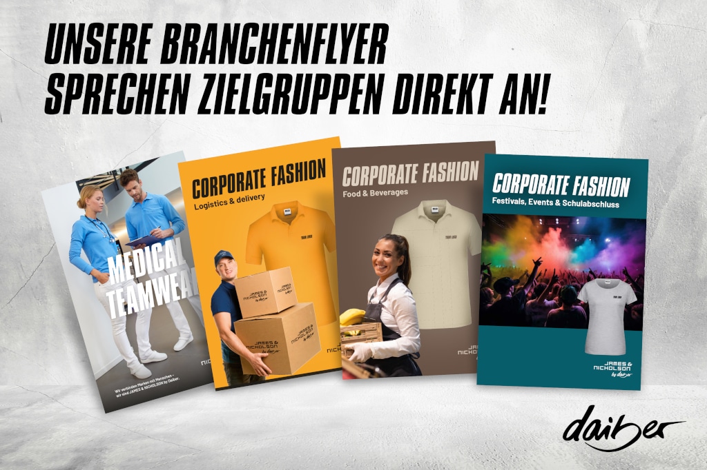 Als Full-Service-Plattform bietet die Gustav Daiber GmbH ihren Händler:innen ab sofort eine größere Auswahl an Branchenflyern an. Ergänzt um weitere Themenbereiche, Produkte und in überarbeitetem Design enthalten die Branchenflyer Empfehlungen zur Corporate Fashion der Daiber-Eigenmarken James & Nicholson und myrtle beach für unterschiedliche Anwendungsbereiche. Mit zusätzlichen editierbaren Newslettervorlagen unterstütze Daiber seine Händler:innen bei der zielgruppengerechten Kundenansprache.