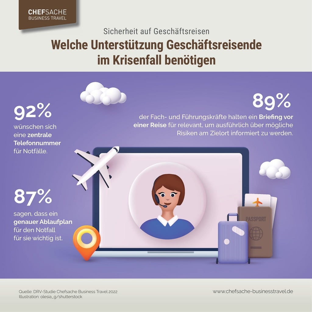 Neun von zehn Geschäftsreisenden halten laut der Studie eine zentrale Notrufnummer auf Reisen für wichtig, angeboten würde dies jedoch nur von 69 % der Unternehmen. 54 % der Reisenden machten sich Gedanken um ihre Sicherheit. Gegenüber 2019 sei das ein Anstieg um 10 %. Lediglich 8 % der Geschäftsreisenden hätten keinerlei Angst um ihre Gesundheit und Sicherheit. 2019 habe dieser Wert laut DRV noch bei 17 % gelegen.