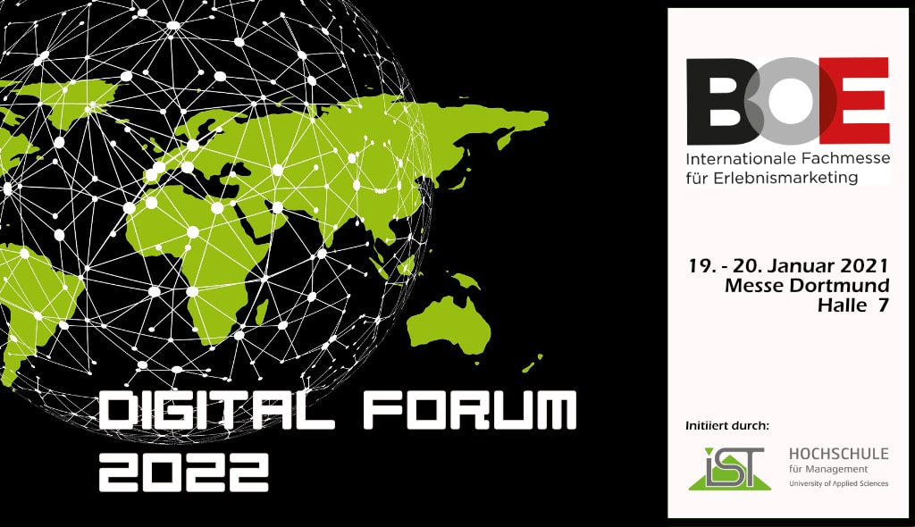 Das Digital Forum, initiiert von der IST-Hochschule für Management, findet auch 2022 wieder im Rahmen der BOE International (19. bis 20. Januar 2022) statt. Bei der sechsten Ausgabe geben Dozierende im 20-Minutentakt Einblicke in verschiedene branchenrelevante Themen. Dazu gehören u. a. Social Media, KI und VR/AR, Gamification, digitale Tools & Trends für das Eventgeschehen sowie digitales Marketing.