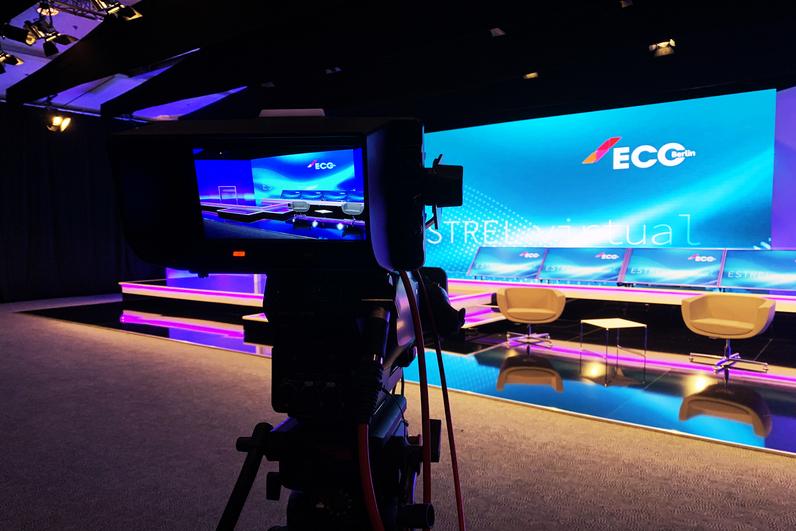 Das multifunktionale fest installierte Studio in dem 800 qm großen Raum 1 des ECC ist ein Mix aus Event-Location und TV-Studio – von hier aus sind neben Live-Streamings und Videokonferenzen von Veranstaltungen auch die interaktive Zuschaltung von Gastrednern, die Durchführung von Echtzeit-Abstimmungen sowie Q&A Sessions realisierbar.