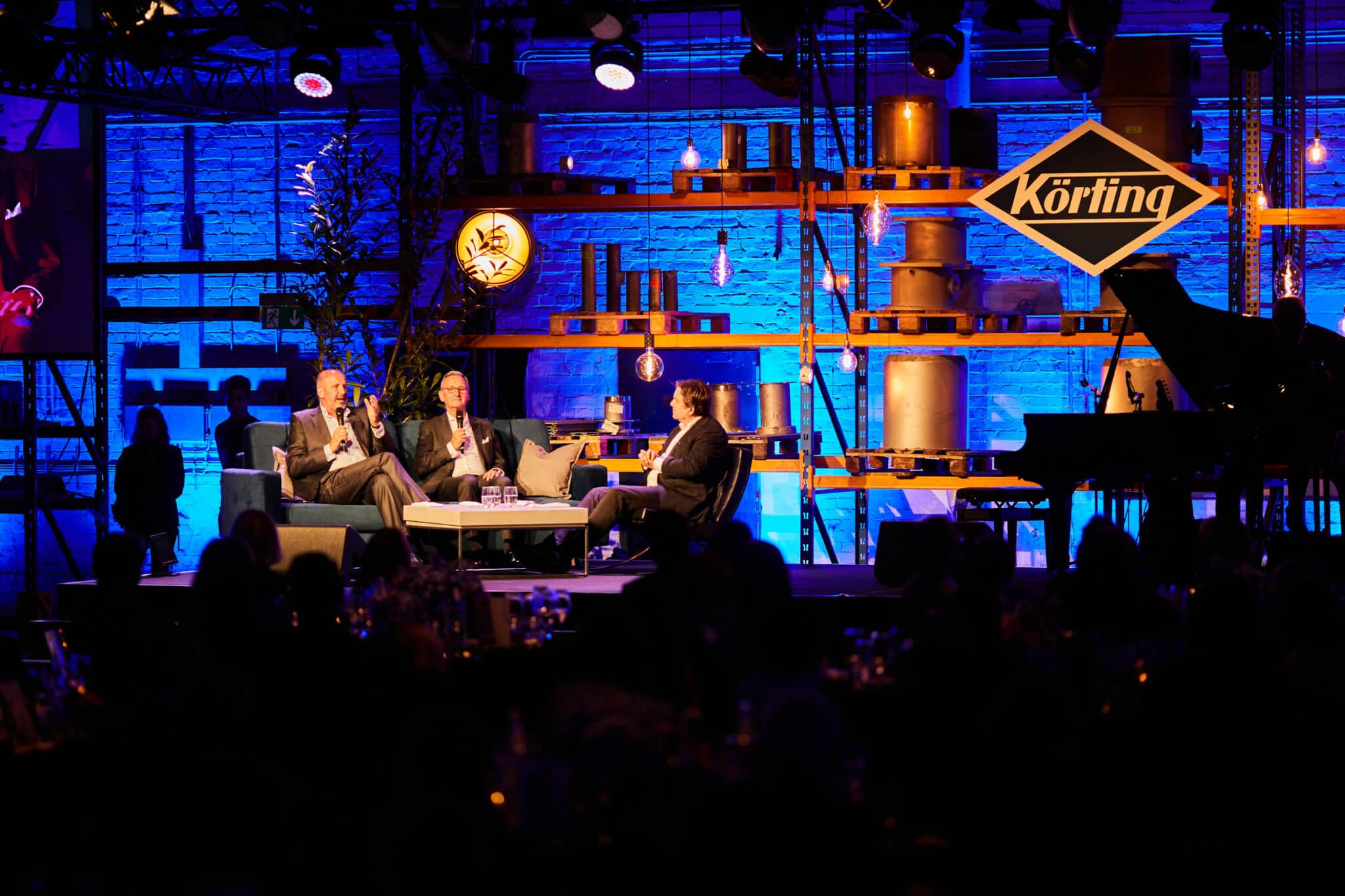 Bei der Gestaltung der Eventfläche in der Werkhalle wurde auf ein hochwertiges und wertschätzendes Gala-Ambiente gesetzt. Fertigungsstücke aus der eigenen Produktion von Körting wurden thematisch passend auf Regalen, der Bühne oder inmitten der Veranstaltungsfläche einbezogen und sollten als spannender Kontrast zur Dekoration Identität und Herkunft des Unternehmens betonen.