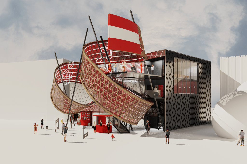 Der österreichische Pavillon wolle die Besucher:innen auf einer Ausstellungsfläche von 270m² mit Musik als Trägermedium von der Vergangenheit in die Zukunft führen. Dabei soll ein zeitgenössisches und modernes Österreich präsentiert und die Vielfalt und Leistungsfähigkeit seiner Wirtschaft und Gesellschaft vorgestellt werden.