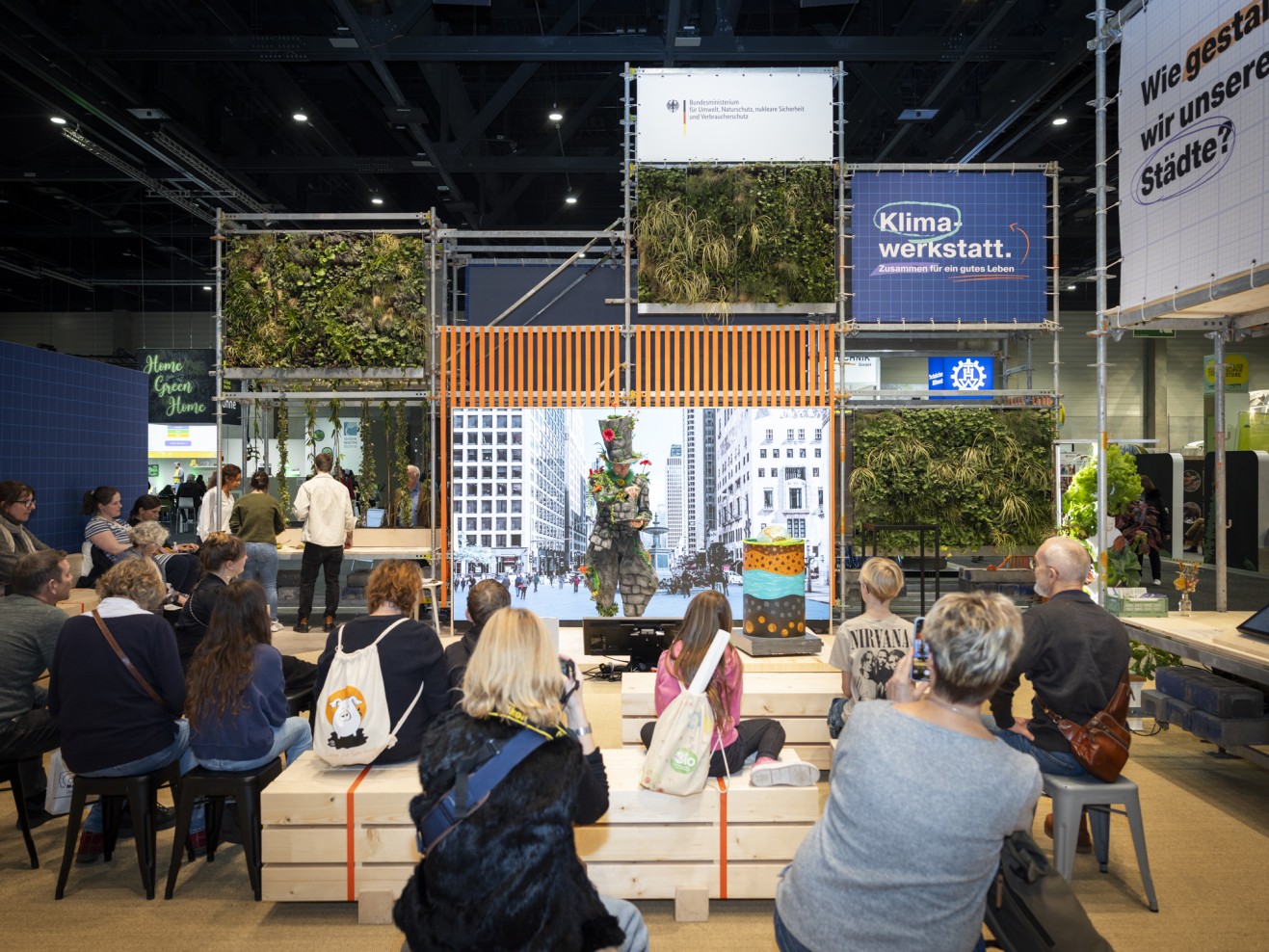 Passend zur Halle “grünerleben” informierte das BMUV auf seinem Stand zur Klimafolgenanpassung und zeigte praktische Maßnahmen für die Umsetzung in der Stadt und auf dem Land. Denn durch den Klimawandel treten extreme Wetterereignisse wie starke, anhaltende Hitzeperioden und Dürren, Starkregen, Stürme und Überschwemmungen häufiger auf. Um die Auswirkungen zu begrenzen und möglichst zu vermeiden, ist die Anpassung an Klimaänderungen nötig.