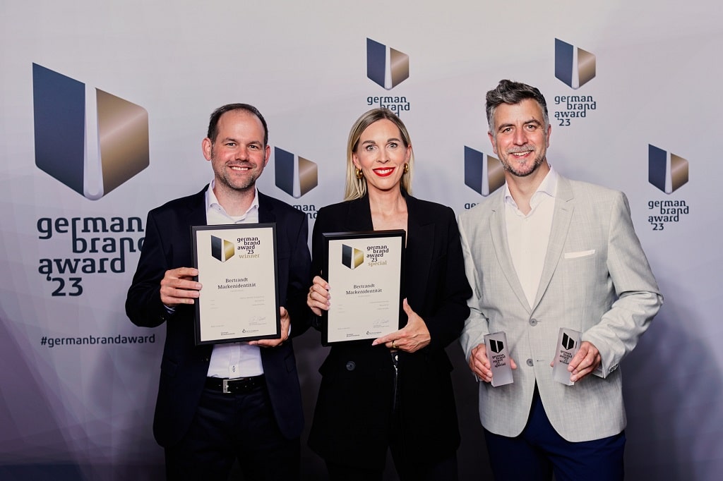 Matthias Bienert von Bertrandt sowie Charlotte Kramer und Sam Heintz von follow red nahmen die Auszeichnungen des German Brand Awards entgegen. (Bild: Grand Visions)
