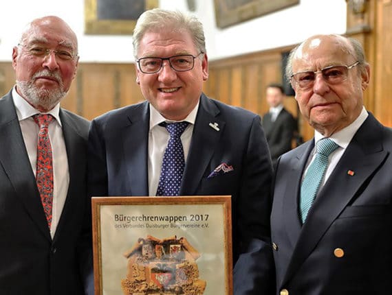 Mit diesem Ehrenpreis bedankt sich der Verband der Duisburger Bürgervereine für geleistete Arbeit zum Wohle der Stadt und ihrer Bürger. Neben Frank Schwarz erhielten Harald Molder von der Zeitzeugenbörse und Werner Halverkamps vom Bürgerverein Wanheimerort diese Auszeichnung