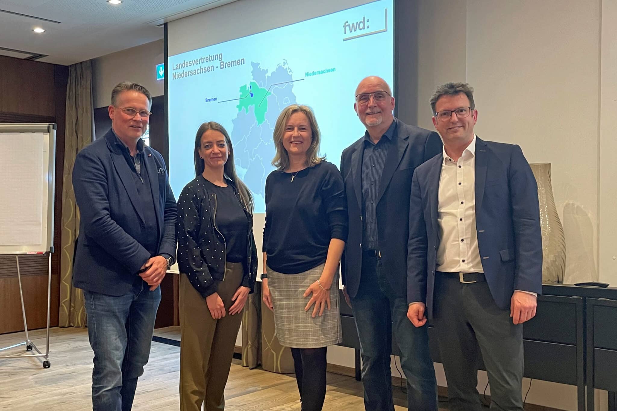 V.l.n.r.: Reinhard Pommerel, Lena Zeissig, Silke Schulte, Matthias Strupowsky und Alexander Ostermaier bei der Gründungsfeier der fünften Landesvertretung Niedersachsen-Bremen (Bild: fwd:)