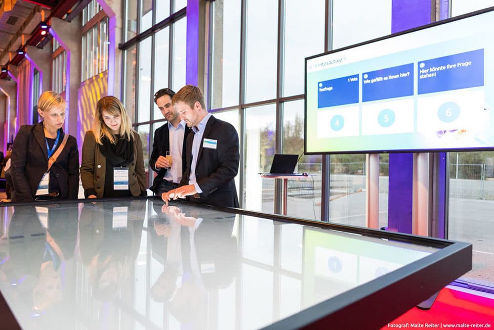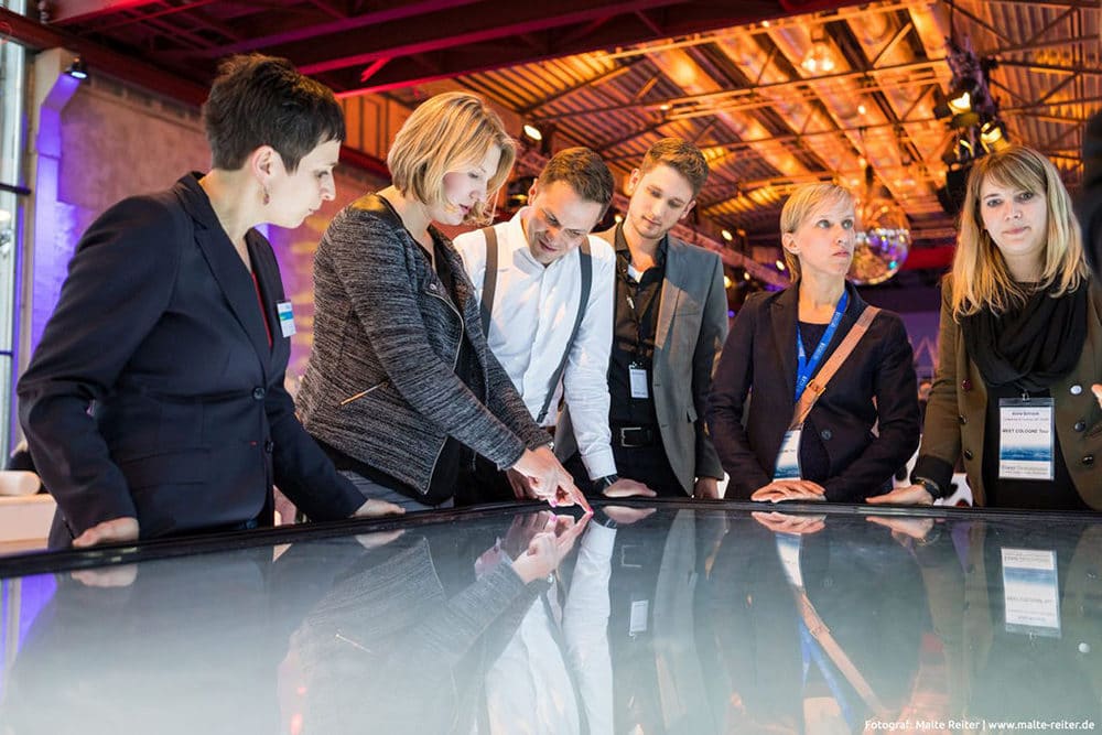 Als Full-Service-Eventdienstleister im Bereich der Veranstaltungstechnik präsentierte sich Gahrens + Battermann gemeinsam mit der Veranstaltungsagentur Intercom für die Region Köln | Düsseldorf. Während der gesamten Veranstaltung stand für alle Gäste das G+B Interactive Space Cafébereit. Unter der Anleitung von Dominik Jakob, Sales G+B Interactive, war „entdecken und selbst ausprobieren“ angesagt. Mit neugierigen Blicken und hohem Interesse wurde dieses Angebot von vielen Besuchern wahrgenommen, die sich von der interaktiven Workshopmöglichkeit begeistern ließen. Ebenso beliebt bei den Gästen war ideaXchange. Hier konnten die Teilnehmer ihre Ideen und Statements mit ihren Smartphones live auf ein Display posten oder über die Posts anderer abstimmen. ideaXchange ermöglicht somit durch die Anonymität des Smartphones ungefiltertes und direktes Feedback noch während der Veranstaltung.