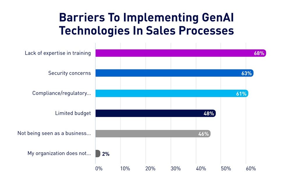 Zu wenig Training sowie Sicherheits- und Compliance-Bedenken sind der Panasonic-Studie zufolge die größten Hindernisse bei der GenAI-Implementierung (Bild: Panasonic „The Ultimate Sales Professional: Integrating Generative AI into Sales“ )