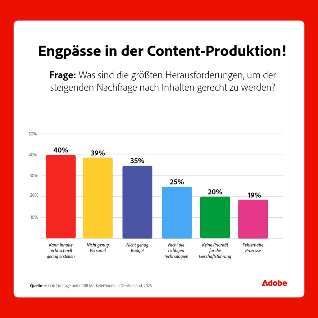 Besonders stark wächst laut der Adobe-Studie die Nachfrage nach Social-Video-Content (43 Prozent), interaktiven Formaten wie Umfragen (33 Prozent) und Livestreams (31 Prozent). Gleichzeitig mangelt es vielen Teams an Zeit, Personal und Prozessen, um ausreichend markenkonformen Content zu liefern. Fast 40 Prozent kämpfen mit ineffizienten Abläufen und aufwändigen Freigabeschleifen – oft mit mehr als drei Abstimmungsrunden pro Asset.