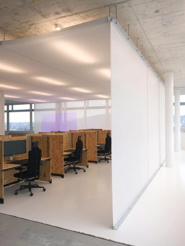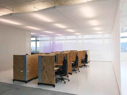 Dies soll auch eine Projektstudie mit weißem Absorber Light in der Open Systems AG in der Schweiz zeigen. Die Anforderungen des IT-Sicherheitsunternehmens: ein offenes Raum-in-Raum-Konzept für eine Büroetage mit ungefähr 800m², das zudem akustisch optimiert sein soll und den Blick auf das Alpenpanorama ermöglicht. In Zusammenarbeit mit dem Planungsbüro Meury Architektur lieferte Gerriets 90m² weißen Absorber Light als Wandverkleidung für den Innenraum. Die Decke des Probeaufbaus wurde aus 100m² des Gerriets Nesselgewebes Shirting gefertigt.
